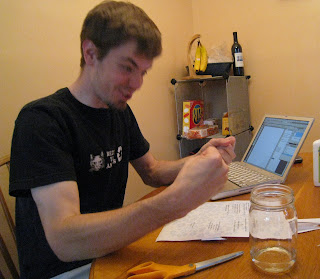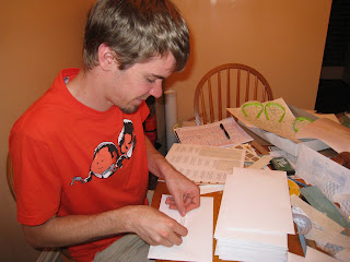 5. Matt attaches address labels. (Side note: He was forced to do this job because the invitations he made looked terrible and had to be thrown away.)